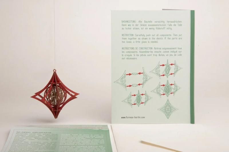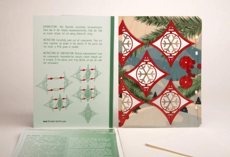 このクリスマスカードのモチーフはカッティングレーザーで型取られており、指で簡単にくり抜け、それを組み立てることで立体オブジェになります。その際に、工具は一切必要ありません。