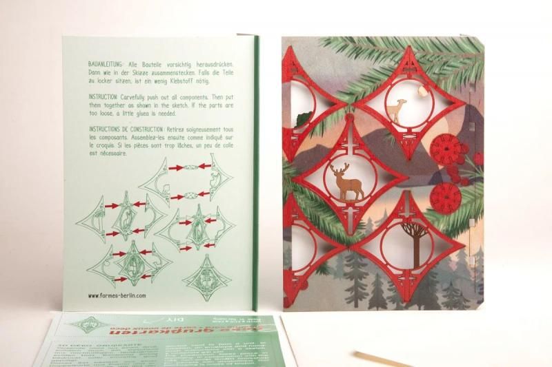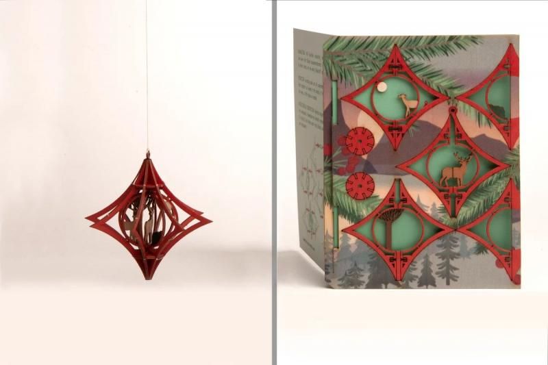 このクリスマスカードのモチーフはカッティングレーザーで型取られており、指で簡単にくり抜け、それを組み立てることで立体オブジェになります。その際に、工具は一切必要ありません。